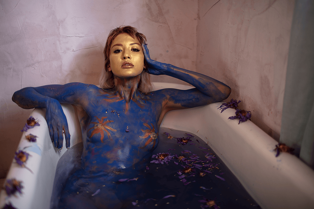 CollectionShot during a winter day in Topanga, California in January 2022, "Blue Lotus" is the third collection from the collaboration between Ryan Frame and Samantha Rose. These images represent a sense of self-reflection while lying in a bathtub. The color palette of blues, purples, and pinks impart a nostalgicically toned atmosphere. Blue Lotus flowers are present in the water; it is said that drinking its tea grants one mystical qualities.