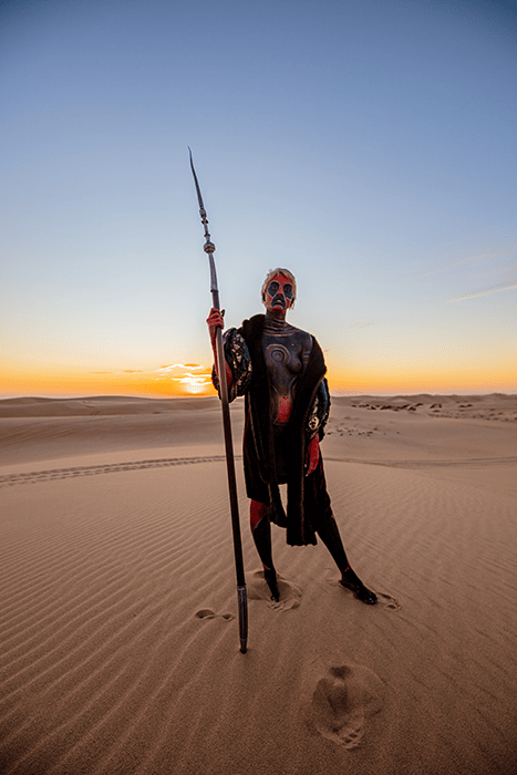 This series, the sixth collaboration with Samantha Rose, was created by ideating and painting her body against the backdrop of sand dunes. The colors and patterns were inspired by the science fiction film "DUNE," and the series explores the idea of extraterrestrial beings by bringing them to earth and juxtaposing them against natural environments.